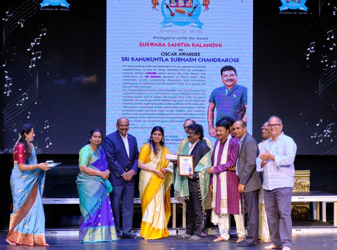 అనంతరం సుస్వర సాహిత్య కళానిధి అనే బిరుదు ఇచ్చి చంద్రబోస్ ను సత్కరించారు. అలాగే చంద్రబోస్ సొంత గ్రామం అయినటువంటి చల్లగరిగెలో ప్రారంభించిన ఆస్కార్ గ్రంథాలయ నిర్మాణానికి 15వేల డాలర్స్ విరాళాలు కూడా అందించారట. అలాగే ఈ కార్యక్రమంలో RP. పట్నాయక్ తన పాటలతో అందరినీ ఆకట్టుకున్నారు. ఈయనకు కూడా సుస్వర నాధానిధి అనే బిరుదుతో సత్కరించారు.