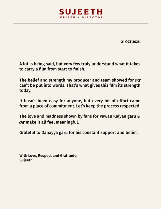 ఓజీ కోసం మా నిర్మాత మరియు.. నా టీం ఇచ్చిన సపోర్ట్, నమ్మకాన్ని నేను నా మాటల్లో వర్ణించలేను. ఓజీ సినిమా పట్ల పవన్ తో పాటు ఆయన అభిమానులు చూపించిన అమితమైన ప్రేమను వర్ణించడం అసాధ్యం అంటూ చెప్పుకొచ్చాడు. దానయ్య సినిమా కోసం నాకు ఇచ్చిన సపోర్ట్, నాపై ఉంచిన నమ్మకానికి ఆయనకు నేను కృతజ్ఞతలు తెలియజేస్తున్న. ప్రేమ, గౌరవం మరియు కృతజ్ఞతలు అంటూ సుజిత్ అఫీషియల్ గా లెటర్ను రిలీజ్ చేశాడు. రిలీజ్ చేసిన ఈ లెటర్ తో వీళ్ళిద్దరి మధ్యన వివాదాల వార్తలకు చెక్ పడింది.