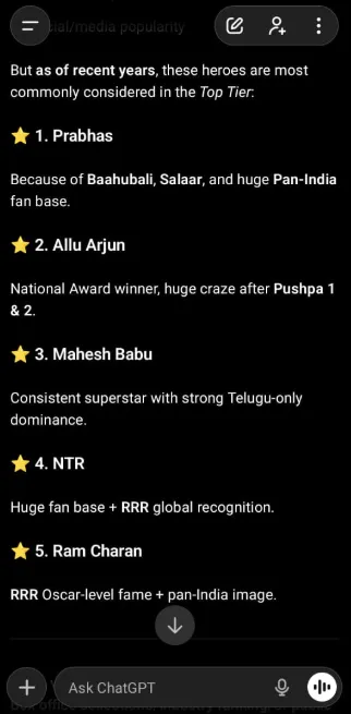 ఇక AI నెంబర్ 2 హీరోగా అల్లు అర్జున్ ను గుర్తించింది. నెంబర్ 3 పోసిషన్ లో మహేష్ బాబు నిలిచాడు. నాలుగు, ఐదు పొజిషన్లో విషయంలో మాత్రం క్లారిటీ లేకుండా.. చరణ్, ఎన్టీఆర్ ల మధ్యన కాస్త పోటీ కనిపిస్తోంది. ఇక AI ప్రకారం.. ఎన్ని ఫ్యాన్ వార్లు జరిగినా ప్రభాస్ నెంబర్ 1 హీరో అట. ఈ ర్యాంకింగ్ ఫ్యాన్స్ అభిప్రాయాలకంటే భిన్నంగా ఉన్నా.. ఏఐ సమాధానాలు మాత్రం టాలీవుడ్ పరిస్థితులను అంచనాలు వేస్తూ.. హీరోలకు ఉన్న క్రేజ్, ఫ్యాన్ ఫాలోయింగ్, సోషల్ మీడియా ట్రెండ్స్ ఆధారంగా రిజల్ట్ చూపిస్తుంది. కనుక.. ప్రస్తుతం AI రిలీజ్ చేసిన ఈ స్టార్ హీరోల లిస్ట్ హాట్ టాపిక్ గా మారింది.