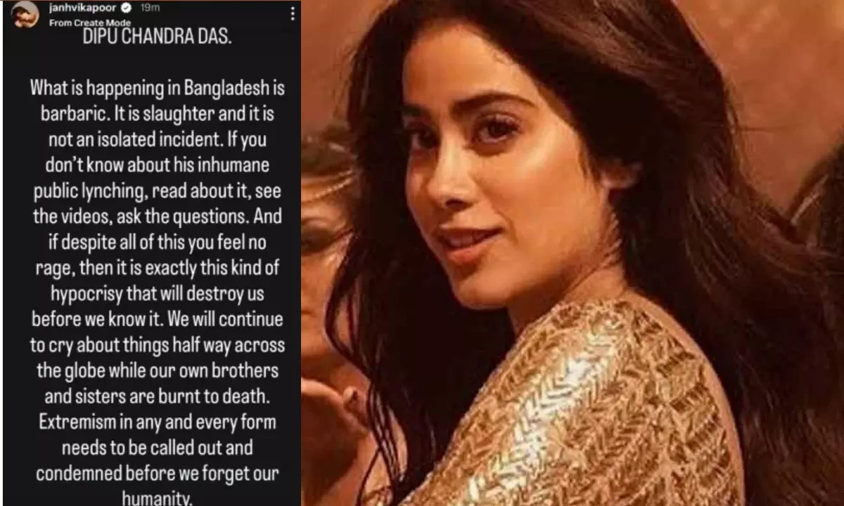 ప్రజెంట్ బంగ్లాదేశ్‌లో జరుగుతున్న హిందూ మతస్తుల మారణకాండ గురించి అందరికీ తెలిసిందే. తాజాగా చంద్రదాస్ అనే హిందూమతస్తుని ఓ ముఠా తీవ్రంగా కొట్టి చంపేసి.. ఆ డెడ్ బాడీని అక్కడే చెట్టుకు కట్టేసి నిప్పంటిచ్చేసారు. ఈ ఘోరం మొత్తం దేశంలోనే కలకలం గా మారింది. దీనిపై ఇండియా రగిలిపోతుంది. అదే టైంలో కొంతమంది తమ నిరసనను వ్యక్తం చేస్తున్నారు. ఢిల్లీలోని బాంగ్లాదేశ్ దౌత్య కార్యాలయం ముందు ఘాటుగానే రియాక్ట్‌ అవుతున్నారు. ఇలాంటి టైం లో.. 28 ఏళ్ల స్టార్ హీరోయిన్ జాన్వీ కపూర్ ఇన్‌స్టాగ్రామ్ వేదికగా ఓ స్టోరీని షేర్ చేసుకుంది. ఈ ఘటనపై రియాక్ట్ అవుతూ.. ఆమె చేసిన పోస్ట్ నెటింట వైరల్‌గా మారుతున్నాయి.